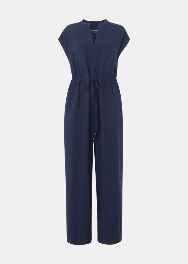 Discover effortless style this season with our Hollie Jumpsuit, featuring a versatile navy hue that transitions seamlessly from day to evening. The flattering V-neckline and adjustable waist drawstring create a customized fit that accentuates your silhouette while providing all-day comfort. This sleeveless jumpsuit offers sophisticated simplicity – just slip it on and you’re ready to go.