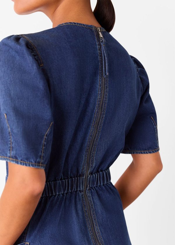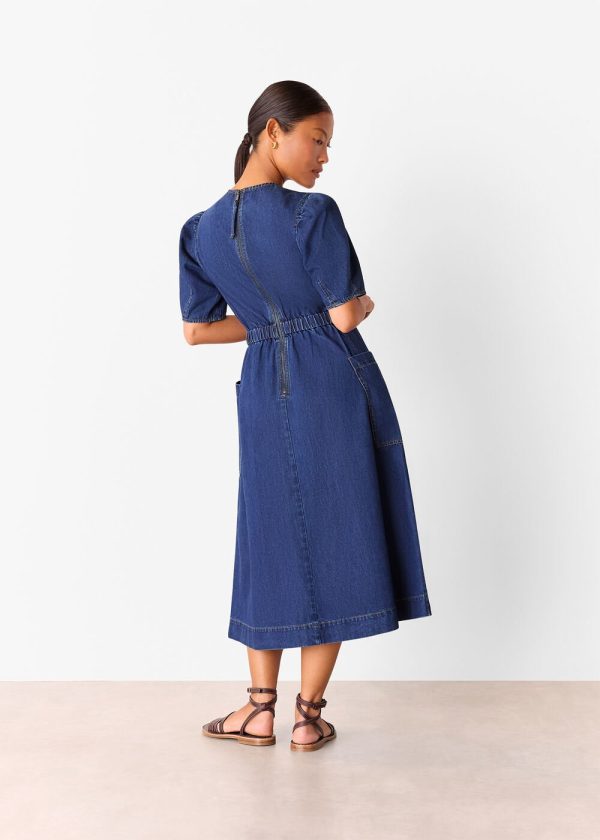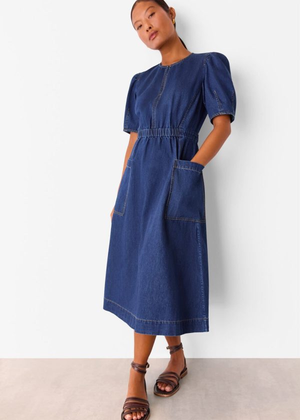 Experience effortless style with our Midi Short Sleeve Dress – your new go-to piece for everyday elegance. Perfect for brunch dates or casual outings, this timeless dark wash denim dress combines sophistication with practical comfort. Featuring a flattering round neckline, adjustable gathered waist, and convenient side pockets that blend style with functionality.