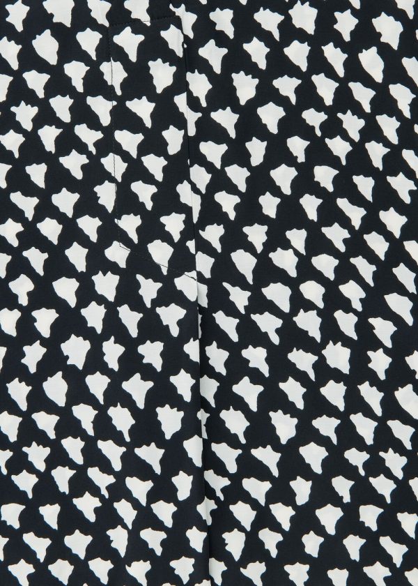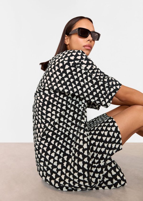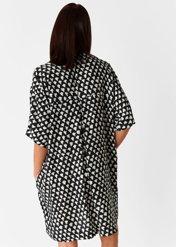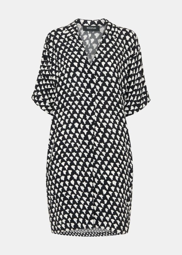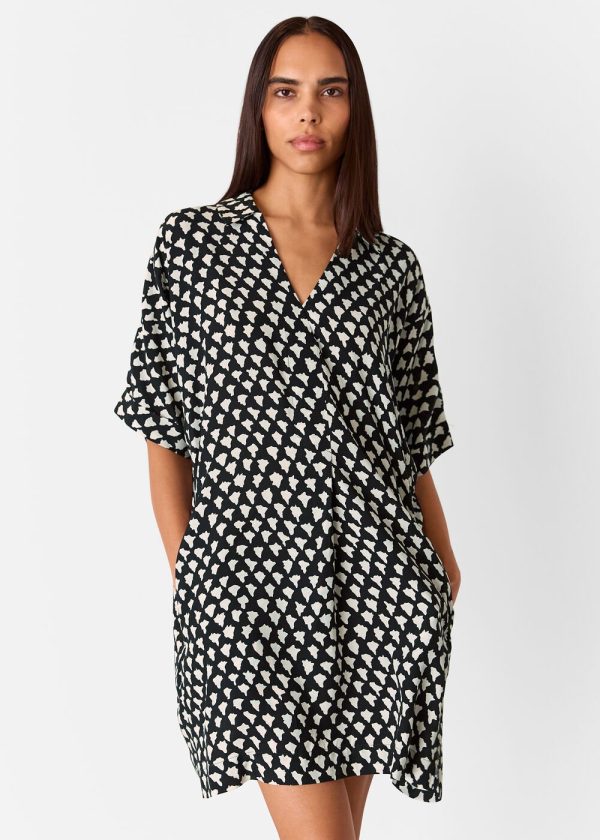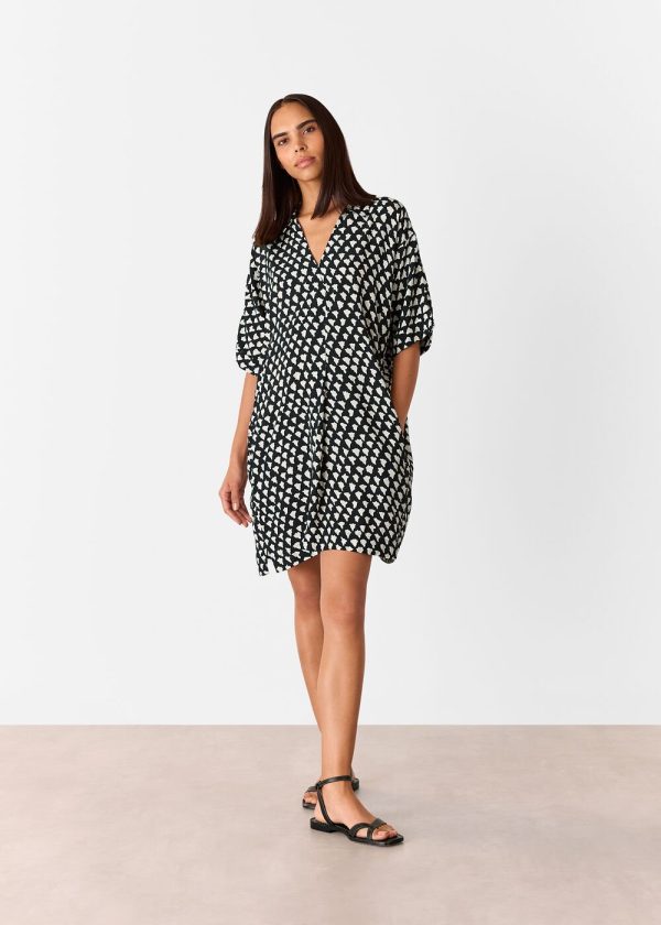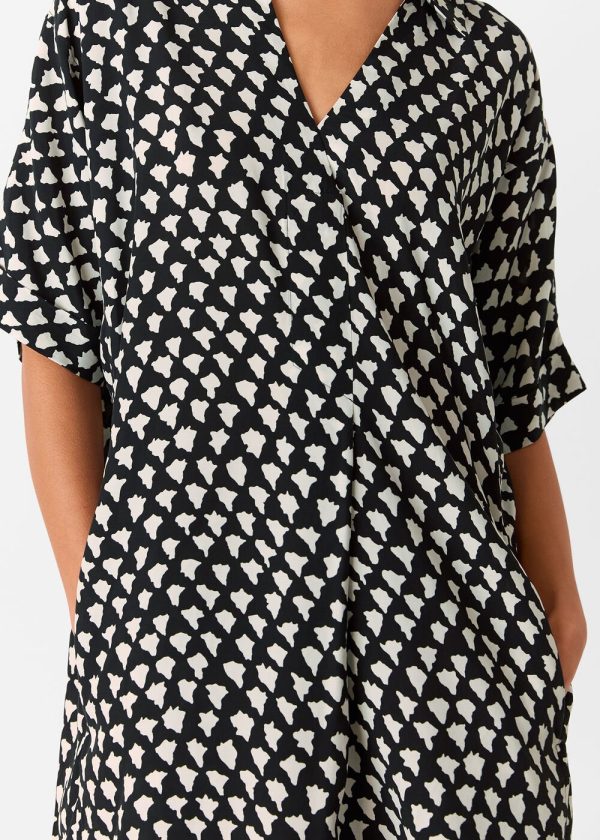 Elevate your wardrobe with this essential printed dress that effortlessly transitions from weekend adventures to daytime gatherings. Featuring a contemporary cocoon silhouette with abstract white triangle patterning against a black background, this versatile piece offers a flattering V-neckline and relaxed short sleeves for all-day comfort.