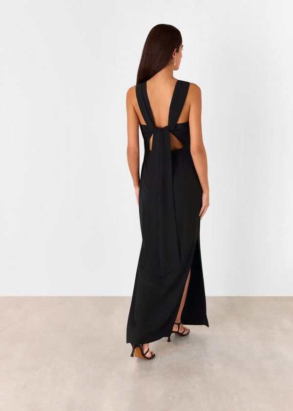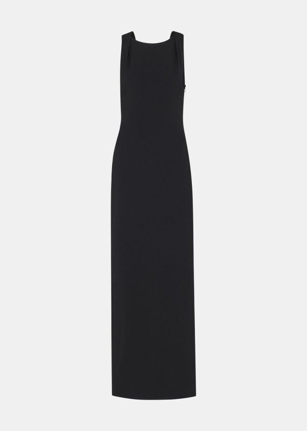Elevate your wardrobe with this contemporary maxi dress that delivers effortless sophistication. Designed with elegant feminine touches including a graceful back tie closure and a beautifully tailored full-length silhouette, this dress offers exceptional flattery and versatile styling options. The timeless black hue creates a polished, refined look that commands attention – simply complete with minimalist accessories to let this stunning piece take center stage.