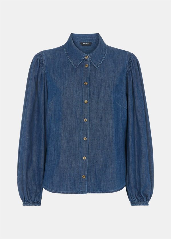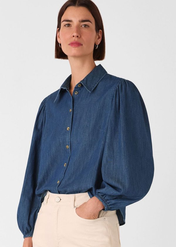 Elevate your wardrobe with our timeless Chambray Cotton Shirt, expertly crafted to seamlessly transition from professional settings to weekend adventures. This contemporary take on a classic features a sophisticated dark wash denim fabric with thoughtful design elements including a gathered back and blouson sleeves that create elegant, subtle volume.