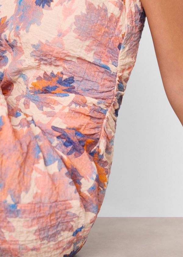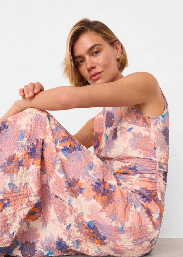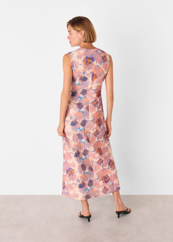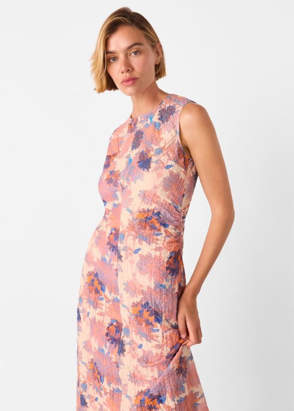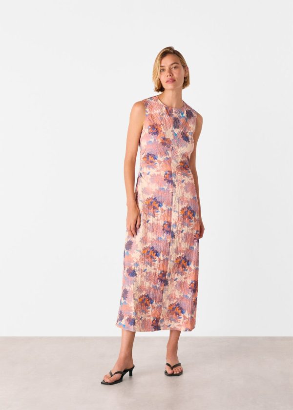Elevate your spring-summer wardrobe with this stunning floral textured midi dress that combines modern elegance with effortless style. Featuring a vibrant floral pattern that transitions beautifully from rich purples to soft pinks, this dress is finished with a delicate textured detail that adds depth and sophistication. The sleeveless design with round neckline and flattering ruched sides creates a polished silhouette perfect for warm-weather occasions.