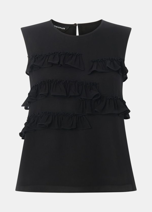 No summer wardrobe is complete without a selection of versatile tops, and our Frill Sleeveless Top is an elevated addition to your weekly rotation. It’s designed in a classic shade of black, complemented with a cropped, boxy silhouette and asymmetric ruffle detailing, giving an elegant, contemporary look for spring-summer. Crafted from a lightweight and floaty fabric, it’s the perfect piece for warm, sun-filled days.