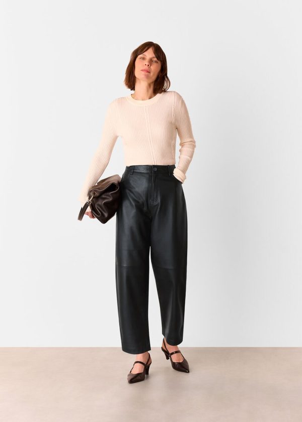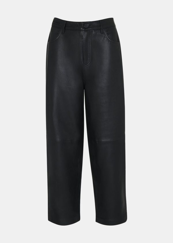 Elevate your wardrobe with our signature barrel leg trousers, now crafted in luxurious black leather. These statement pants feature a high-waist design and wide-cut cropped legs that create a sophisticated silhouette. Perfect for creating fashion-forward looks when paired with chunky boots for an effortlessly chic ensemble.