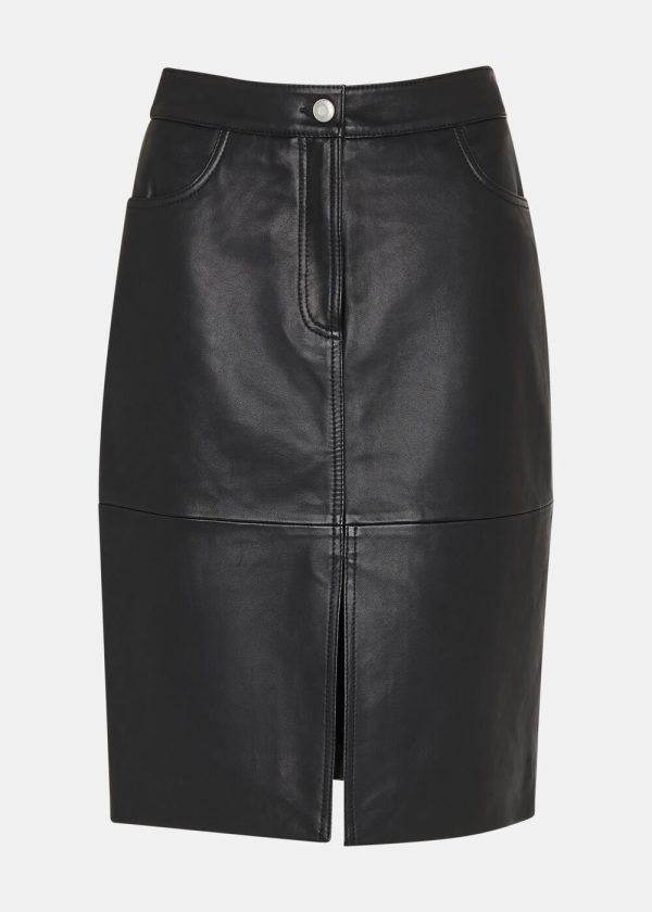 Expertly crafted from premium responsible leather, this sophisticated midi skirt makes a stunning statement piece for your wardrobe. Designed for elegant evening wear and special occasions, the timeless black silhouette features a flattering midi length with a dramatic front split that adds modern sophistication. Pair effortlessly with crisp white tees or your favorite cozy knits for versatile styling options.