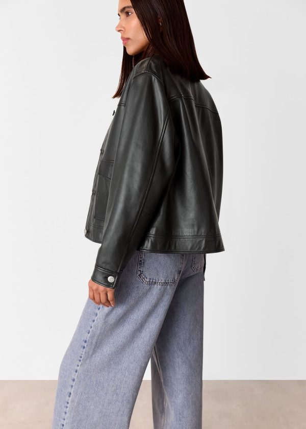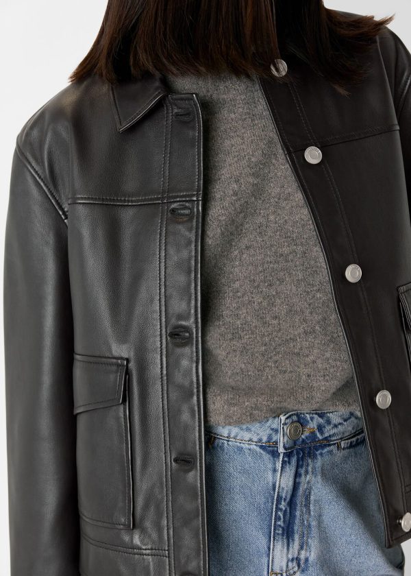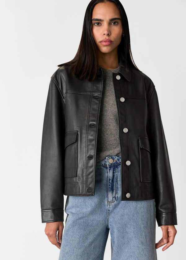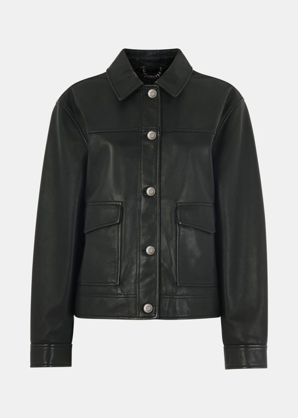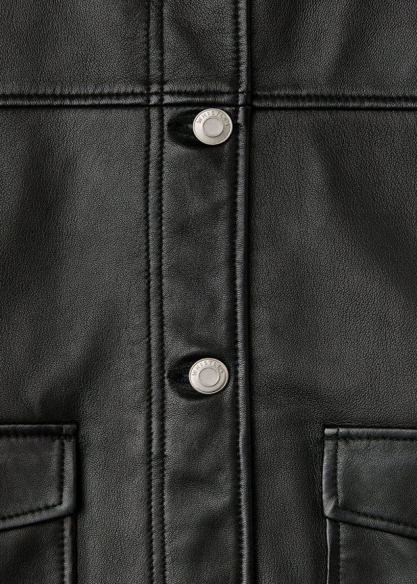 Master the art of versatile layering with this sophisticated leather overshirt that perfectly bridges the gap between tailored shirt and lightweight jacket. Crafted from premium supple leather in timeless black, this piece delivers exceptional quality and refined elegance. Layer it over your favorite tee for elevated everyday style or pair it with a midi dress for polished evening sophistication.