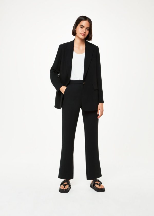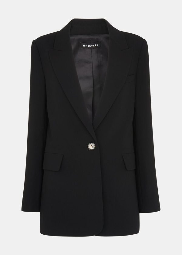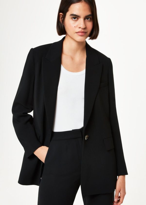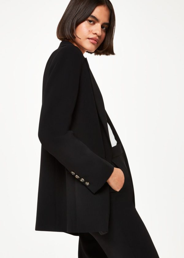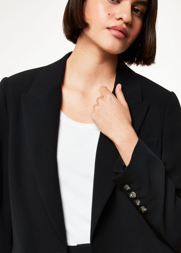 Discover the perfect blend of sophistication and comfort with our boyfriend blazer featuring a modern relaxed fit that’s designed to become your go-to wardrobe essential. Crafted from premium black crepe fabric, this blazer showcases a contemporary boxy silhouette with sharp peak lapels for elevated style. Perfect for pairing with your favorite denim for a chic casual look.