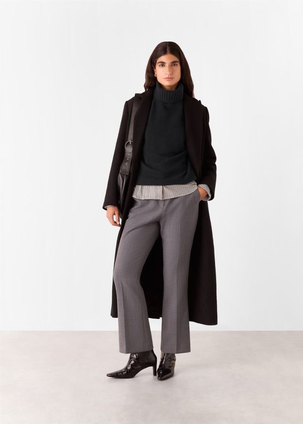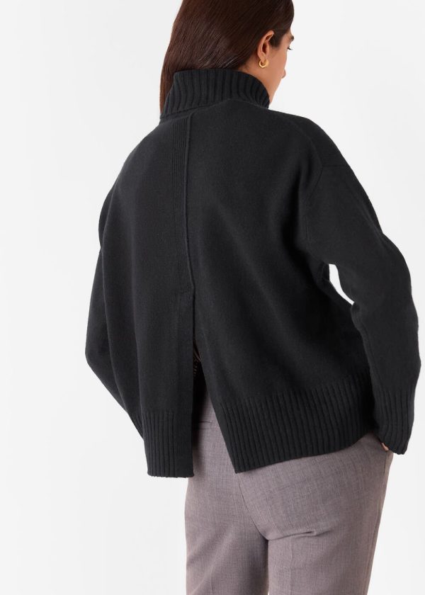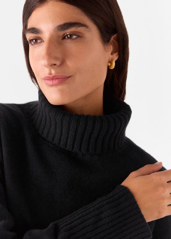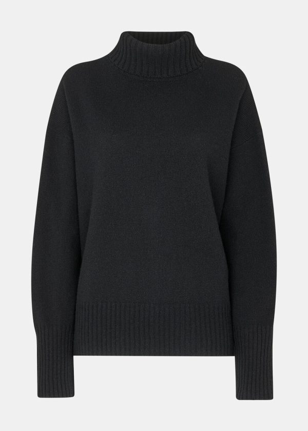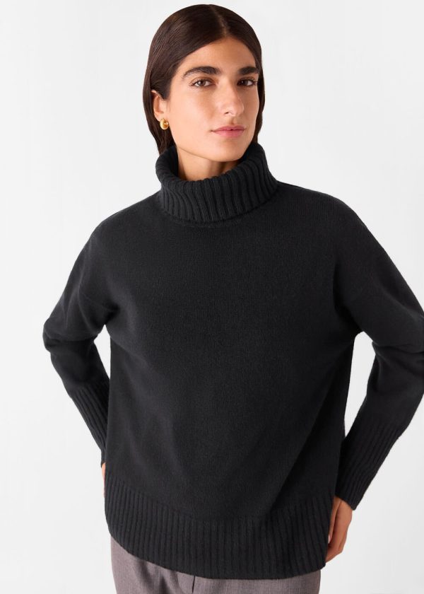 Discover the Whistles Knitwear Collection, featuring sophisticated silhouettes crafted from premium materials. This elegant turtleneck sweater comes in a versatile black hue, expertly fashioned from a wool blend that delivers exceptional warmth and comfort throughout the fall and winter seasons. The classic roll neck design provides cozy protection against chilly weather, while the distinctive back splits offer stylish versatility for easy layering. Relaxed dropped shoulders create a modern, comfortable silhouette complemented by wide ribbed trims for a polished finish.