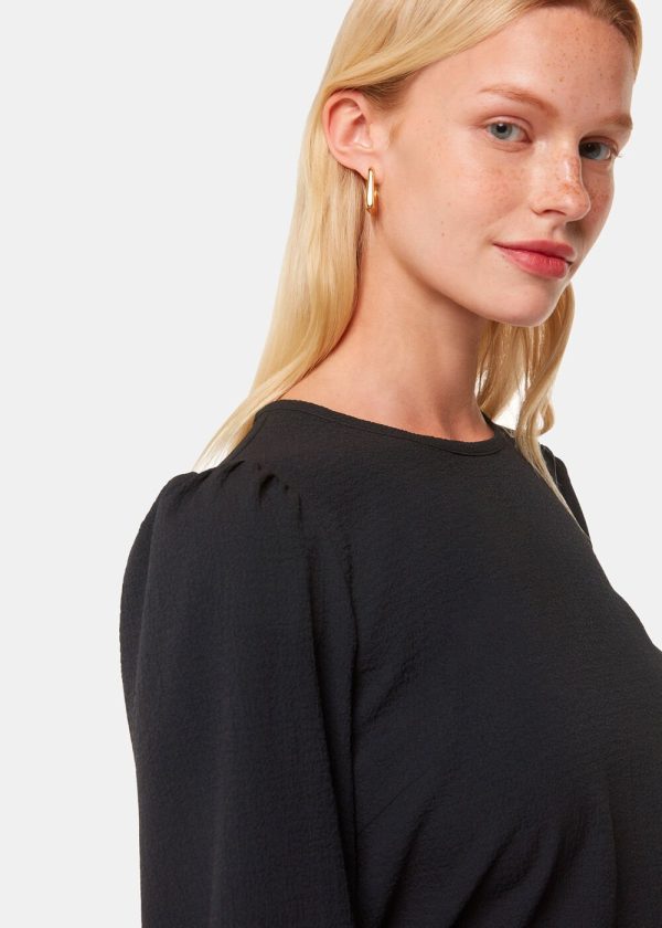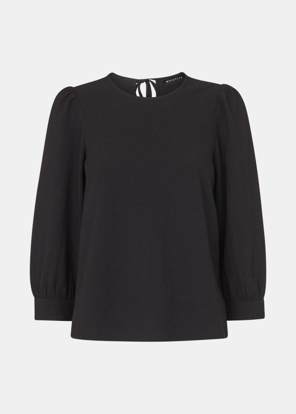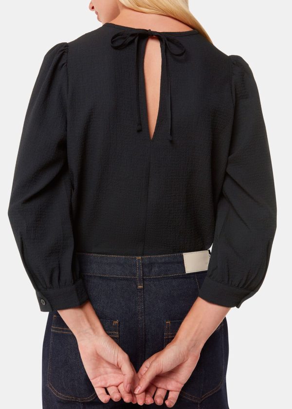 Crafted in timeless black, this elegant blouse features a comfortable relaxed fit through the bodice with a subtly textured fabric that adds depth to your look. Perfect for pairing with your favorite denim for an effortlessly chic ensemble that transitions seamlessly from day to evening.