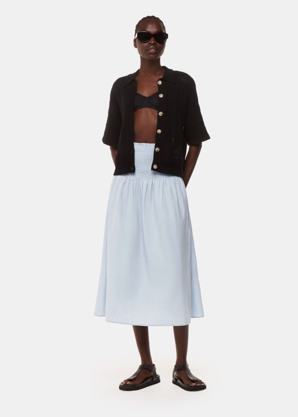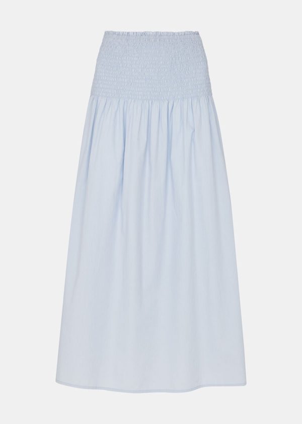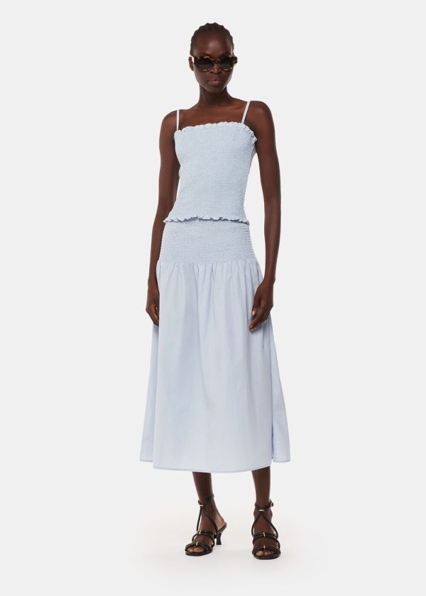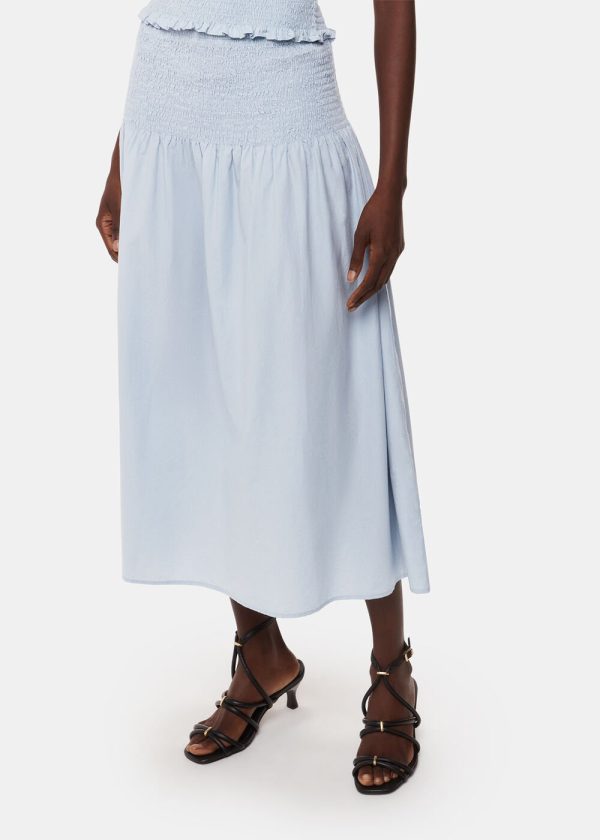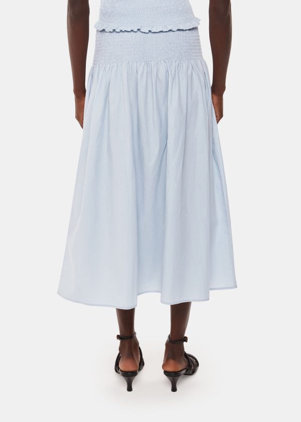 Meet your new go-to skirt for the season – the Louisa Smocked Midi Skirt. Designed for effortless style, this skirt features a classic silhouette in a beautiful blue hue. Experience exceptional comfort with its wide smocked waistband that contours to your shape while the graceful A-line cut moves beautifully with you throughout the day.
