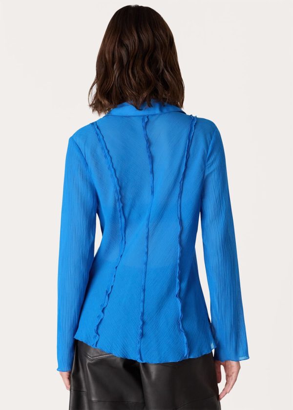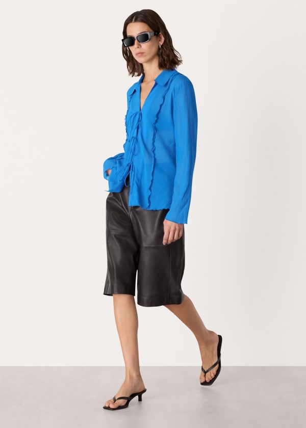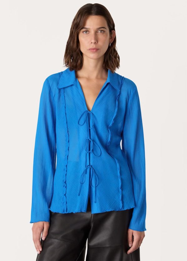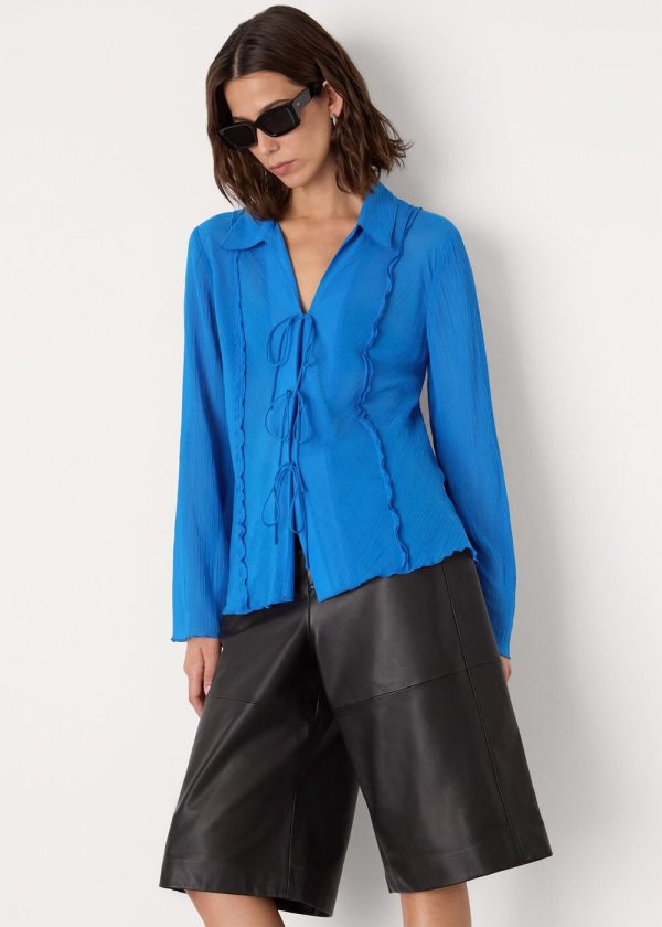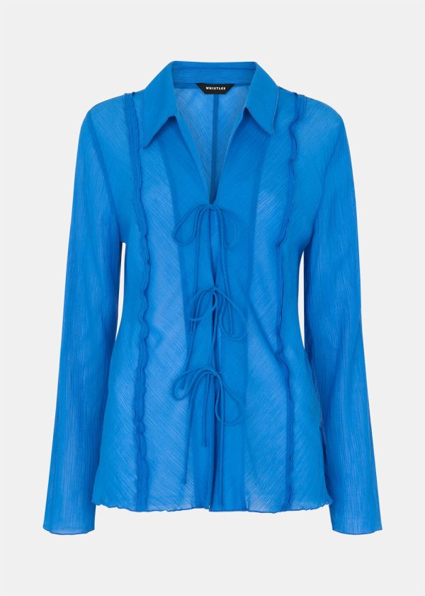 Elevate your wardrobe with our stunning blue Tie Front Textured Shirt, designed to make a sophisticated statement. This contemporary bohemian-inspired top features a beautifully textured fabric enhanced with delicate frill accents, a stylish knot closure, and a flattering collared V-neckline that adds timeless elegance to any outfit.