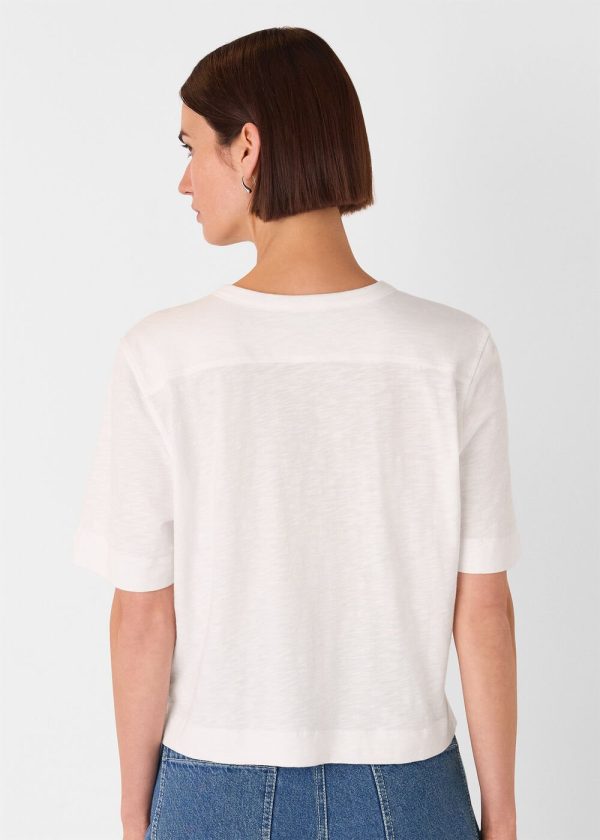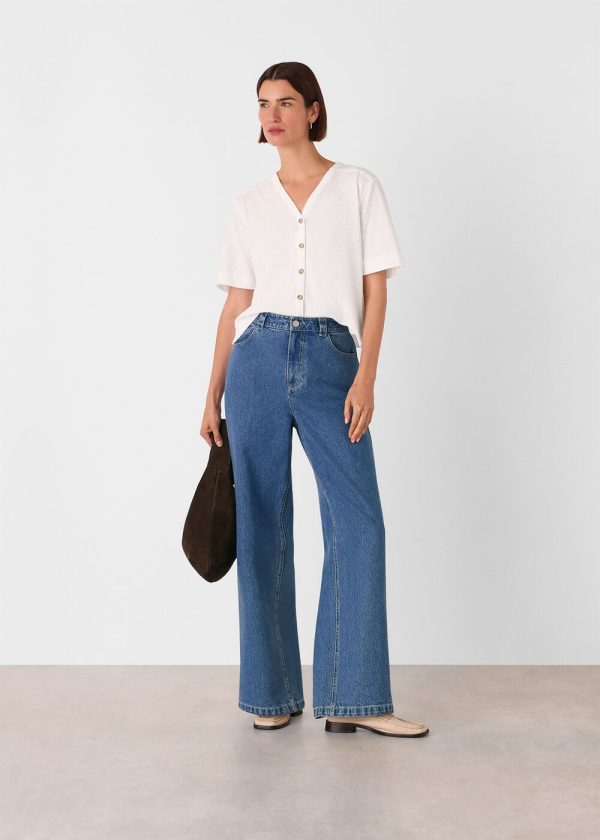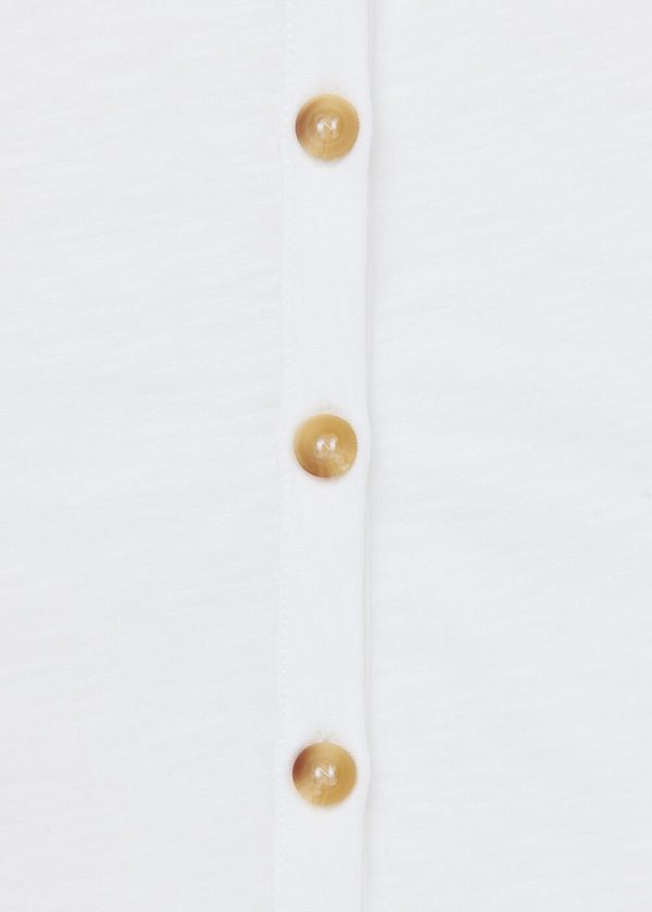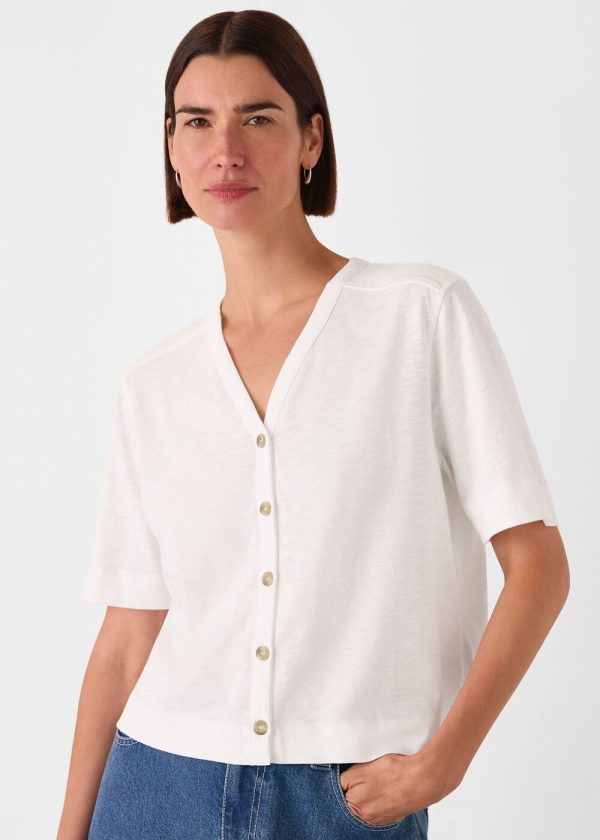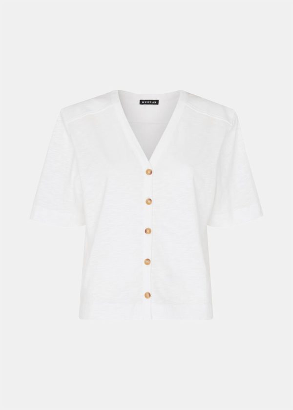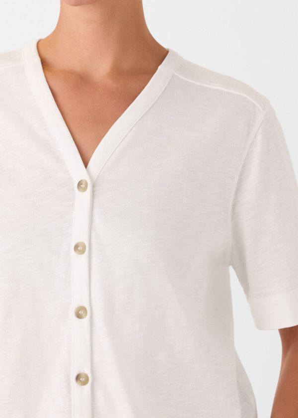 Our Ella V-Neck Tee delivers effortless style for warm weather and serves as a versatile wardrobe essential you’ll reach for season after season. Designed with a lightweight feel, this classic white top features a flattering V-neckline and chic front button details. Perfect for pairing with your favorite high-waist jeans.