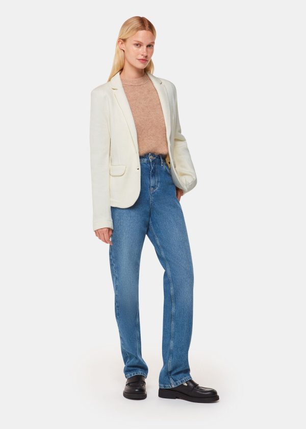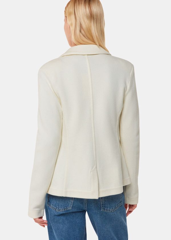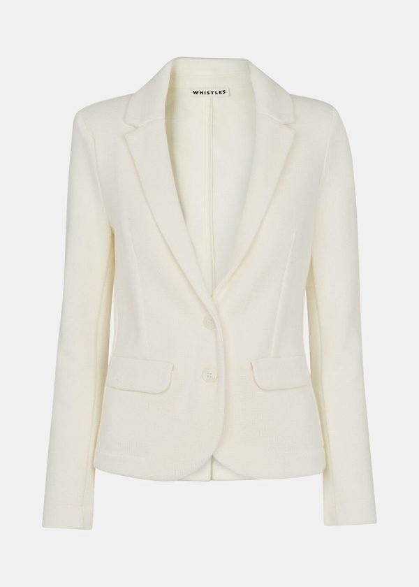 Expertly crafted from premium cotton jersey, this elegant ivory jacket features long sleeves, a refined collar, and sophisticated welt pockets. The slim silhouette contours beautifully at the waist, delivering a polished, defined shape that elevates any outfit. Perfectly pairs with everything from tailored black trousers to your favorite straight-leg jeans and chic midi dresses.