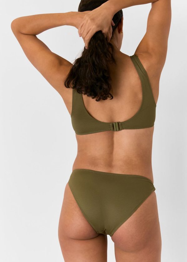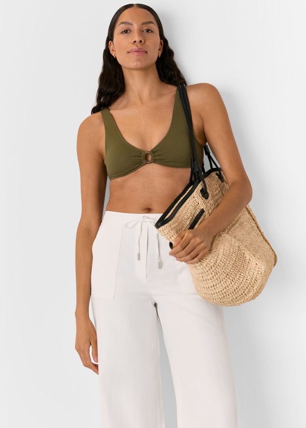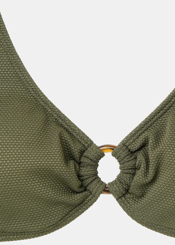 Planning your next vacation escape? Our Ring Detail Bikini Top, designed to coordinate perfectly with its matching bottom, is ideal for sun-drenched beach days and poolside lounging. Expertly crafted in a timeless khaki hue and featuring an elegant ring detail at the center, this piece adds a sophisticated touch to your resort wardrobe.