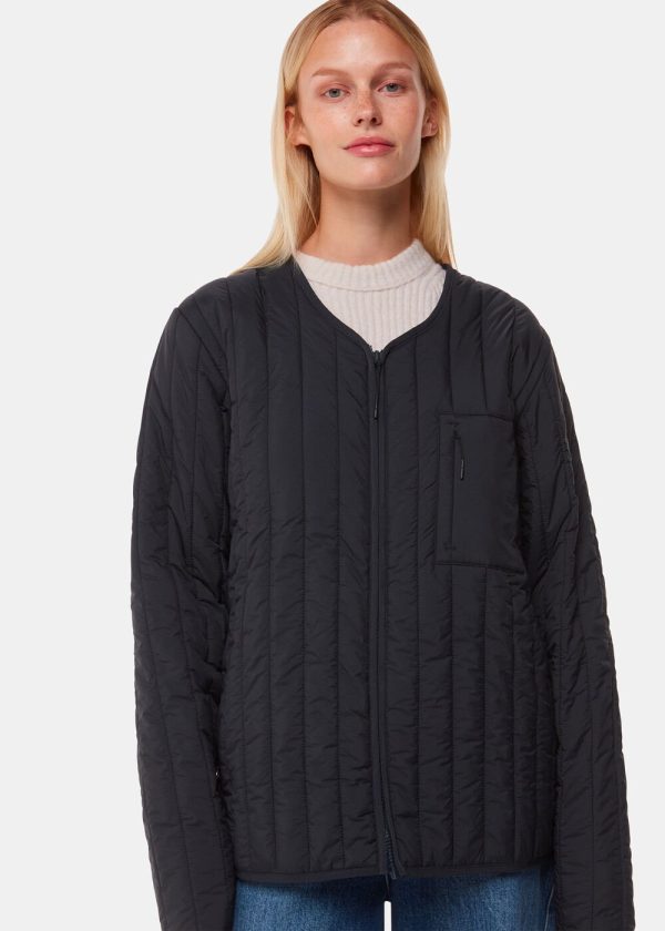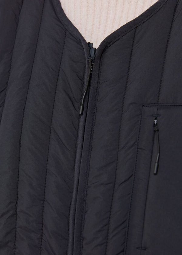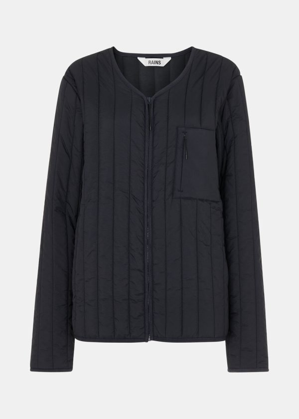 This versatile Rains Liner Jacket serves as the perfect transitional piece, designed to layer effortlessly under outerwear or stand alone as a lightweight top layer. The classic navy design features insulating padding with clean oversized quilting that locks in warmth without bulk. Practical details include a secure zipped chest pocket, convenient slip pockets, snap-fastening shirt cuffs, and a modern bomber-inspired collar. Crafted from breathable ripstop fabric, this jacket combines quilted comfort with reliable weather protection.