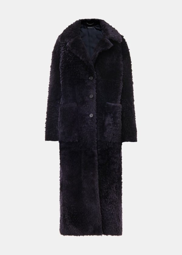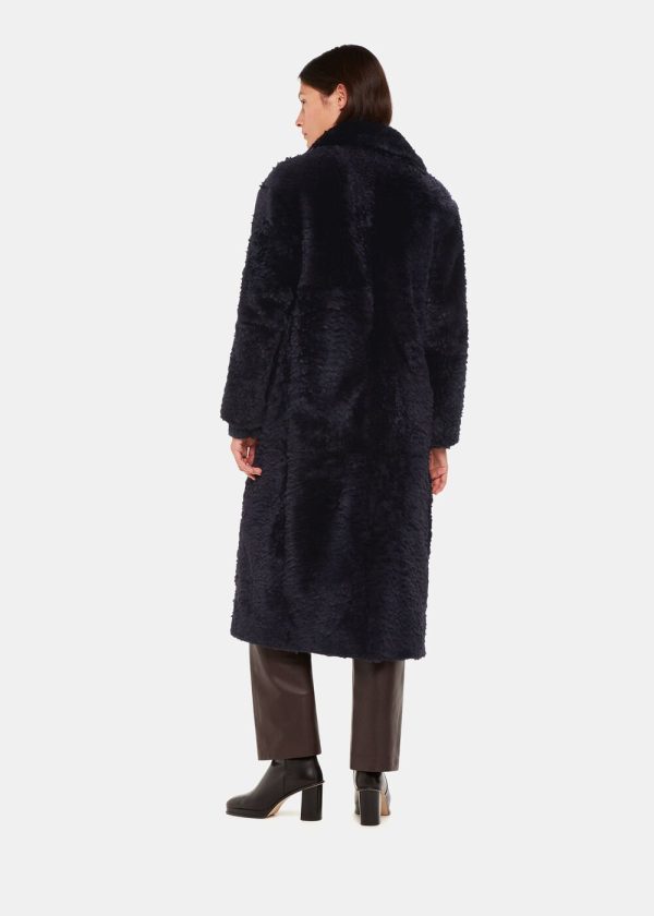 Crafted in a sophisticated navy hue, this premium 100% shearling coat features an elegant longline silhouette that effortlessly layers over everything from casual knits and denim to dressier ensembles. Designed with a regular fit and secure button closure, this coat ensures you stay perfectly cozy and stylish during chilly weather.