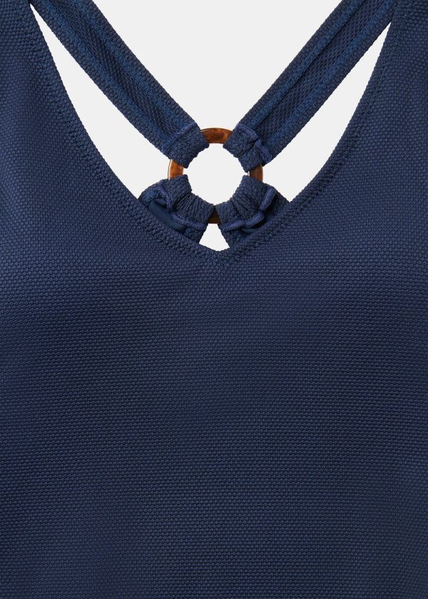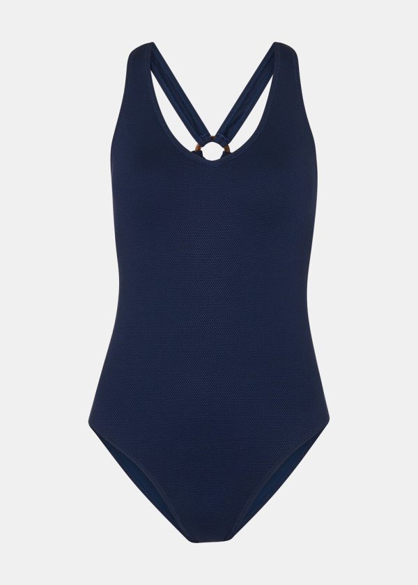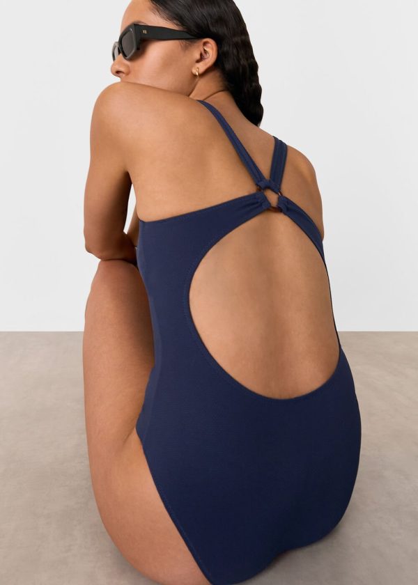 Elevate your swimwear collection with this sophisticated one-piece that masterfully blends timeless elegance with contemporary design. Our Textured Ring Detail Swimsuit features a stunning navy hue with a modern crossover back accented by chic ring detailing. Engineered for exceptional comfort and support, this versatile swimsuit transitions effortlessly from beach lounging to poolside cocktails, and layers perfectly under your favorite cover-ups.