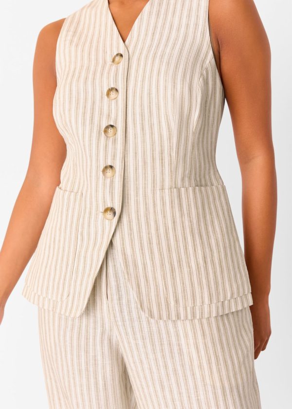 Elevate your seasonal wardrobe with our effortlessly chic Linen Stripe Waistcoat, designed for sophisticated everyday wear. Crafted from breathable linen fabric with subtle neutral striping, this versatile piece features functional flap pockets and a back fastening that creates beautiful waist definition. Wear it as part of a complete tailored set with matching trousers or style it individually with your favorite separates for endless outfit possibilities.