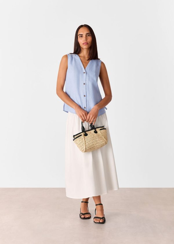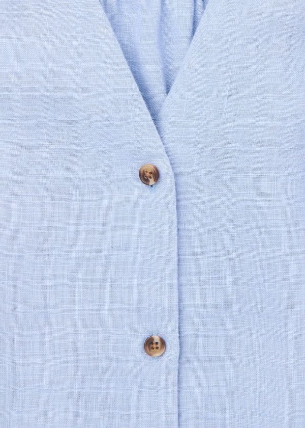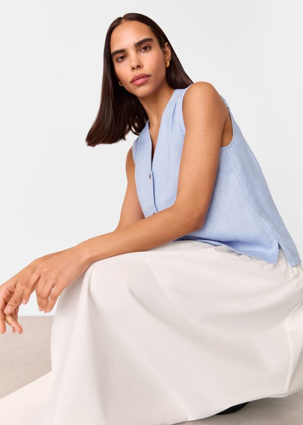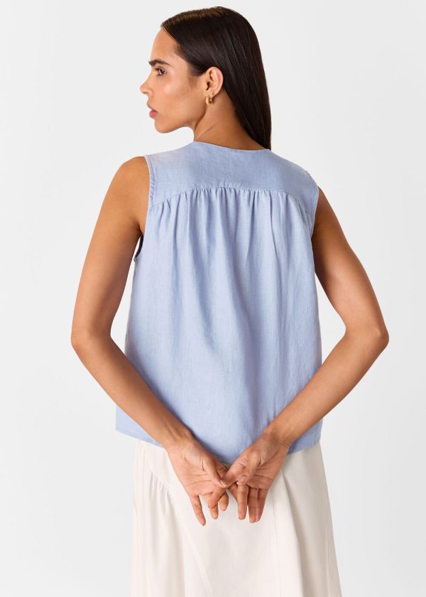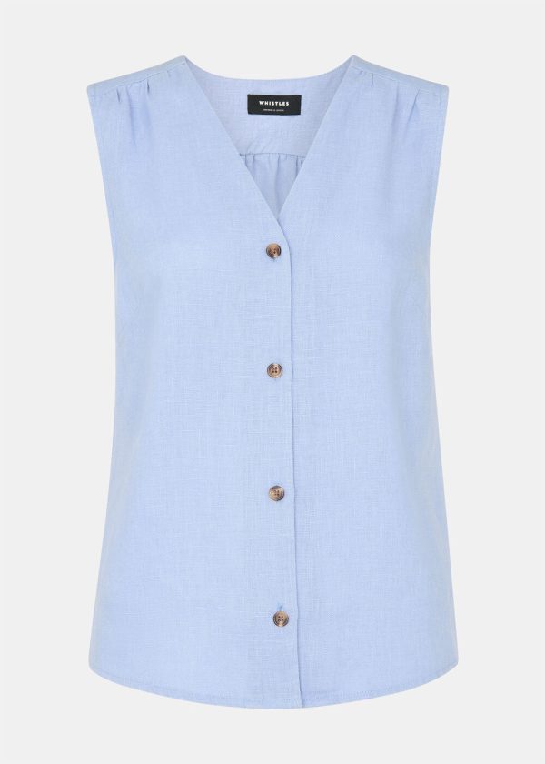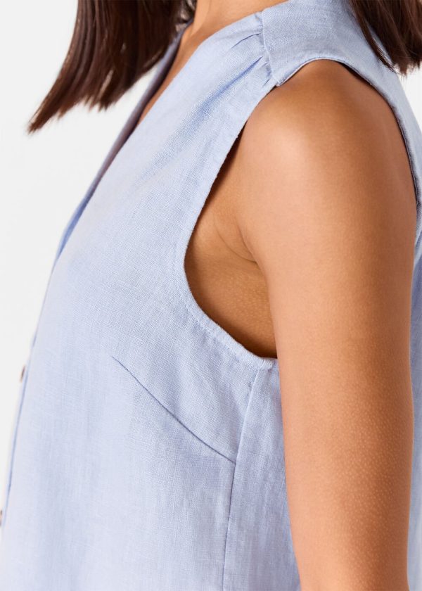 Elevate your warm-weather wardrobe with our effortlessly chic Laura Linen Tank, designed to deliver both style and comfort. This pale blue beauty features a flattering V-neckline with front button details that create a polished, put-together look. Perfect for pairing with your favorite white trousers and gold accessories for that timeless summer ensemble.
